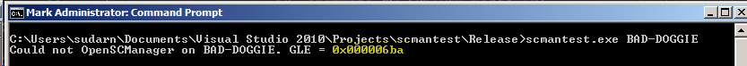 The above code tries to Open the SCM and if that fails then it reports the Win32 error. You can Bing! this error to find out what action to take. The application scmantest takes 1 parameter which is the Machine Name. So if you PC is called WorkPC.domain.company.com, then you would run this from the command prompt like this