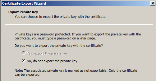 This is definitely outside the realms of SQL Server. When you try to export the certificate you get to the screen where you have to choose the option to export the Private Key of the certificate, but the option is greyed out as shown below.
