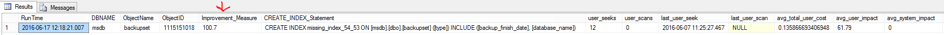 USE [msdb] /*Replace with your Database Name */ GO SELECT TOP 50 GETDATE() AS [RunTime], DB_NAME(mid.database_id) AS [DBNAME], OBJECT_NAME(mid.[object_id]) AS [ObjectName], mid.[object_id] AS [ObjectID], CONVERT (decimal (28,1), migs.avg_total_user_cost * migs.avg_user_impact * (migs.user_seeks + migs.user_scans)) AS [Improvement_Measure], 'CREATE INDEX missing_index_' + CONVERT (varchar, mig.index_group_handle) + '_' + CONVERT (varchar, mid.index_handle) + ' ON ' + mid.statement + ' (' + ISNULL (mid.equality_columns,'') + CASE WHEN mid.equality_columns IS NOT NULL AND mid.inequality_columns IS NOT NULL THEN ',' ELSE '' END + ISNULL (mid.inequality_columns, '') + ')' + ISNULL (' INCLUDE (' + mid.included_columns + ')', '') AS [CREATE_INDEX_Statement], migs.user_seeks, migs.user_scans, migs.last_user_seek, migs.last_user_scan, migs.avg_total_user_cost, migs.avg_user_impact, migs.avg_system_impact, mig.index_group_handle, mid.index_handle FROM sys.dm_db_missing_index_groups mig INNER JOIN sys.dm_db_missing_index_group_stats migs ON migs.group_handle = mig.index_group_handle INNER JOIN sys.dm_db_missing_index_details mid ON mig.index_handle = mid.index_handle WHERE CONVERT (decimal (28,1), migs.avg_total_user_cost * migs.avg_user_impact * (migs.user_seeks + migs.user_scans)) > 10 AND mid.database_id = DB_ID() ORDER BY [Improvement_Measure] DESC GO